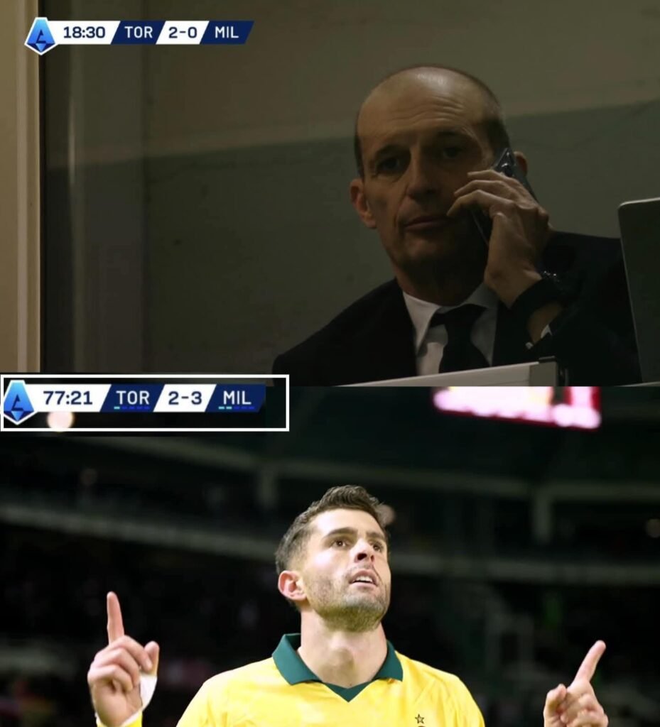 Imagine, Milan had lost their manager Allegri, were trailing Torino 2-0 at halftime, and Rafael Leão was injured and had to leave the field.