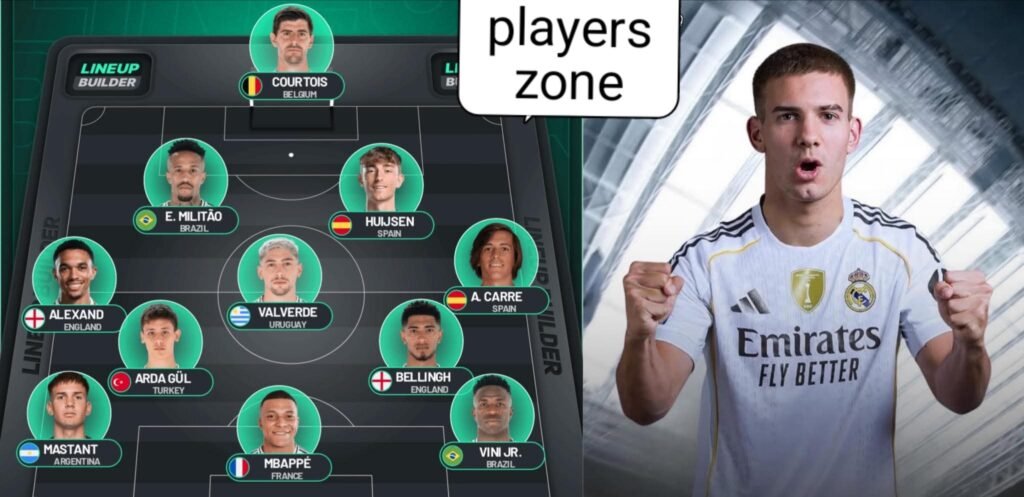 Vinicius, Rodrygo, Endrick, Mastrantuono, Bellingham, Camavinga, Tchouameni, Odegaard, and Guller.