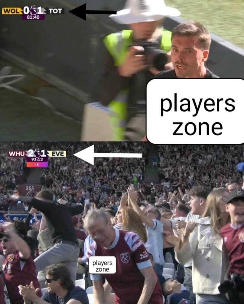 West Ham went crazy and scored the winning goal in the 92nd minute, putting them two points behind Tottenham so that the West Ham fans could celebrate the hysterical celebration you see here—a great league in every detail.